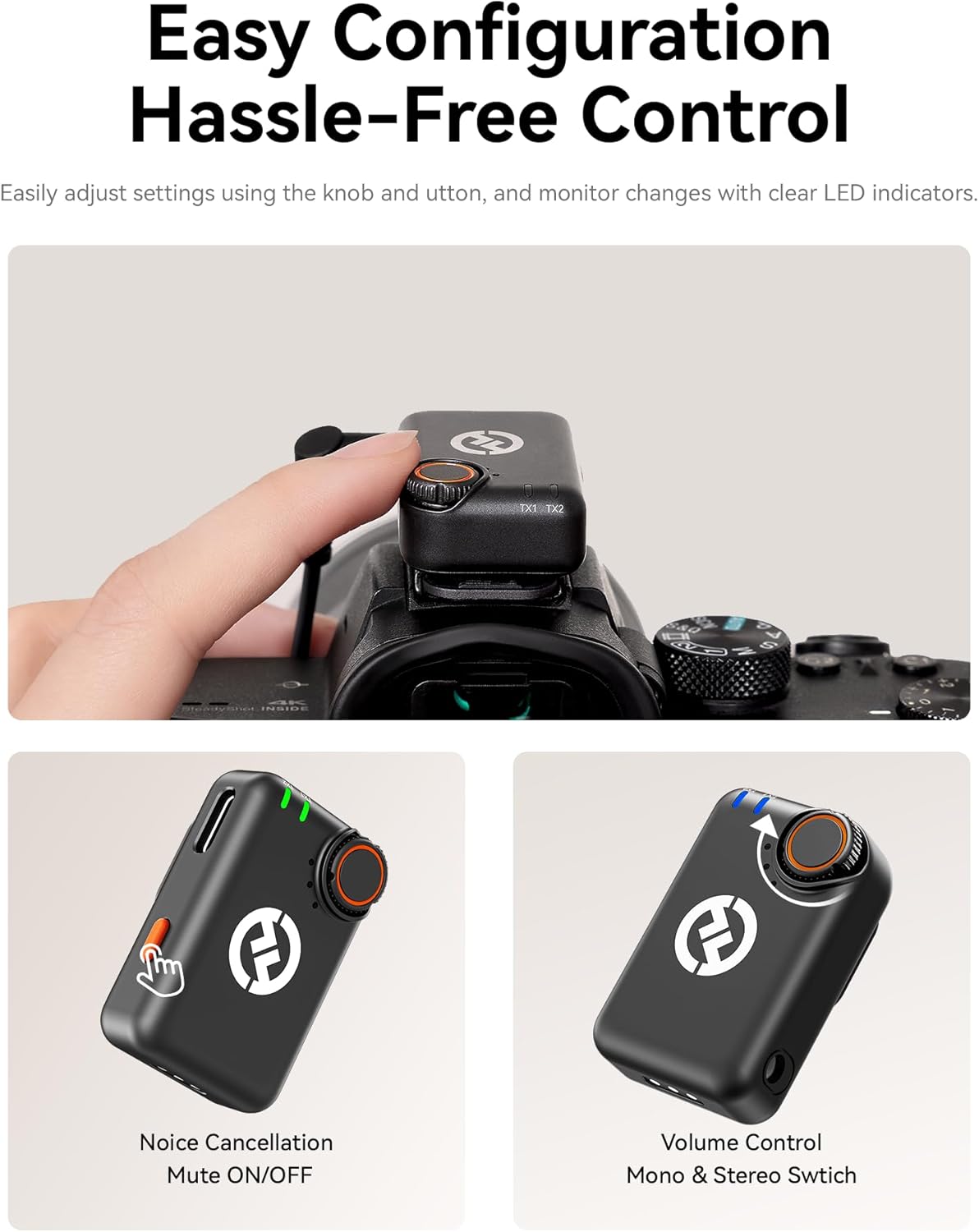 Este kit incluye 3 receptores intercambiables (para cámara, USB-C y Lightning), lo que permite conectarlo directamente a iPhone, Android, PC, Mac o cámaras DSLR/Mirrorless. Su transmisión digital 2.4 GHz garantiza un sonido nítido y estable con alcance de hasta 300 m (en línea de vista).